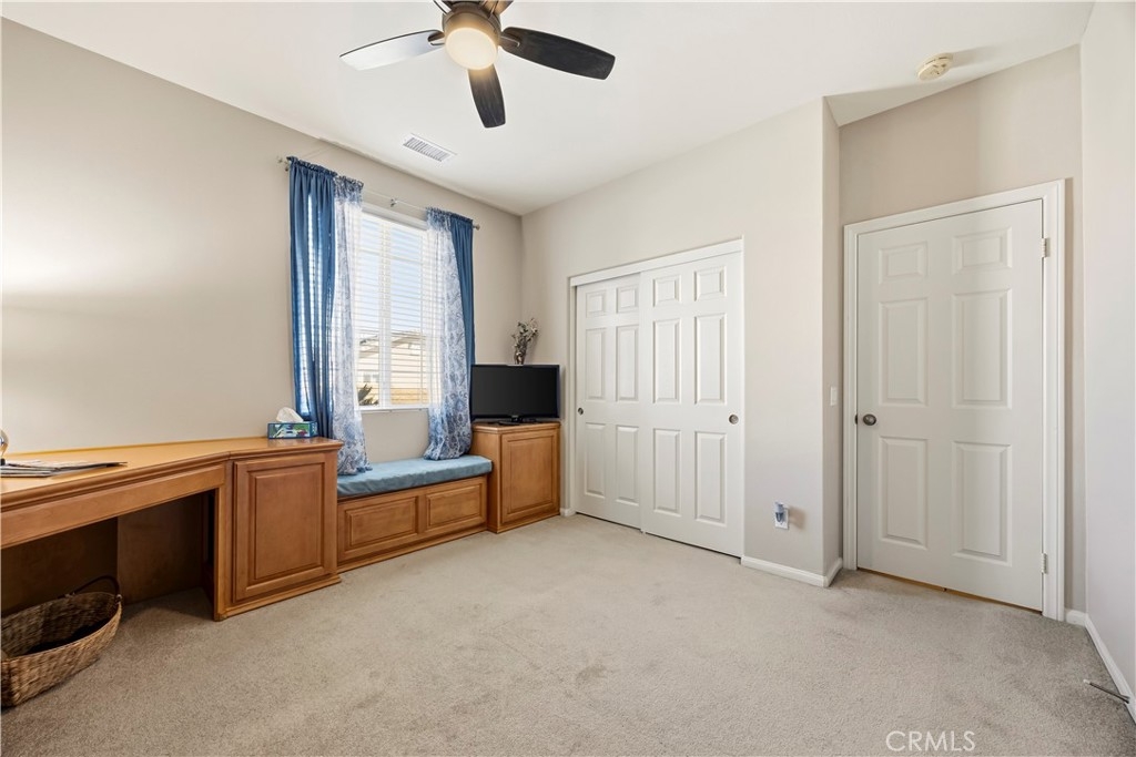 **Assumable VA loan at 3.0% for qualified buyers** Welcome to a rare opportunity to own a piece of Menifee’s finest, offered for the very first time by its original owners. From the moment you pull up to this meticulously maintained Lennar home, the pride of ownership is unmistakable. Built in 2009 and kept in pristine condition, this residence offers a level of care and detail that only a single-owner history can provide. Step through the front door and experience a spacious, light-filled layout that perfectly balances comfort and functionality. With five generous bedrooms and three full bathrooms, the interior provides an abundance of space to live, work, and retreat. One bedroom is located at the primary floor, with a Murphy bed and corner desk with a full bathroom, for your in-laws or guests. This home has been thoughtfully enhanced with fresh paint; The entire second floor and the expansive 3-car garage have been recently repainted. Modern Lighting & Comfort; The home is illuminated with plenty of LED recessed lighting and features upgraded ceiling fans in every room. The open-concept design flows seamlessly from the inviting living areas to the kitchen, showcasing the classic Lennar quality. The story continues outside, where the property truly sets itself apart. Situated on an expansive, flat lot with increased spacing between neighbors, the backyard serves as a massive blank canvas for your vision—be it a pool, an outdoor kitchen, or a lush garden. Existing outdoor highlights include: An ample patio cover and a wraparound concrete belt offer easy access and the perfect setting for hosting. Upgraded HVAC: Enjoy total peace of mind with an exterior HVAC unit that was replaced and upgraded in January 2021. Sustainable Energy: An energy-efficient leased solar system is already in place to provide predictable, low energy costs.The Community: Unbeatable Value Located on the quiet and desirable N Bay Lane, this home offers more than just a beautiful structure; it offers a lifestyle. The community features: Minimal Fees, Maximum Amenities: Boasting what is arguably the smallest monthly HOA fee in the entire Inland Empire, you still receive premium perks. Recreation: Residents enjoy a splash pad for the kids, a brand-new basketball court, and exclusive lake access (available with permit and proof of residency at no additional fee), plus 2 pools, a clubhouse with a full kitchen, hiking trails, and more.
