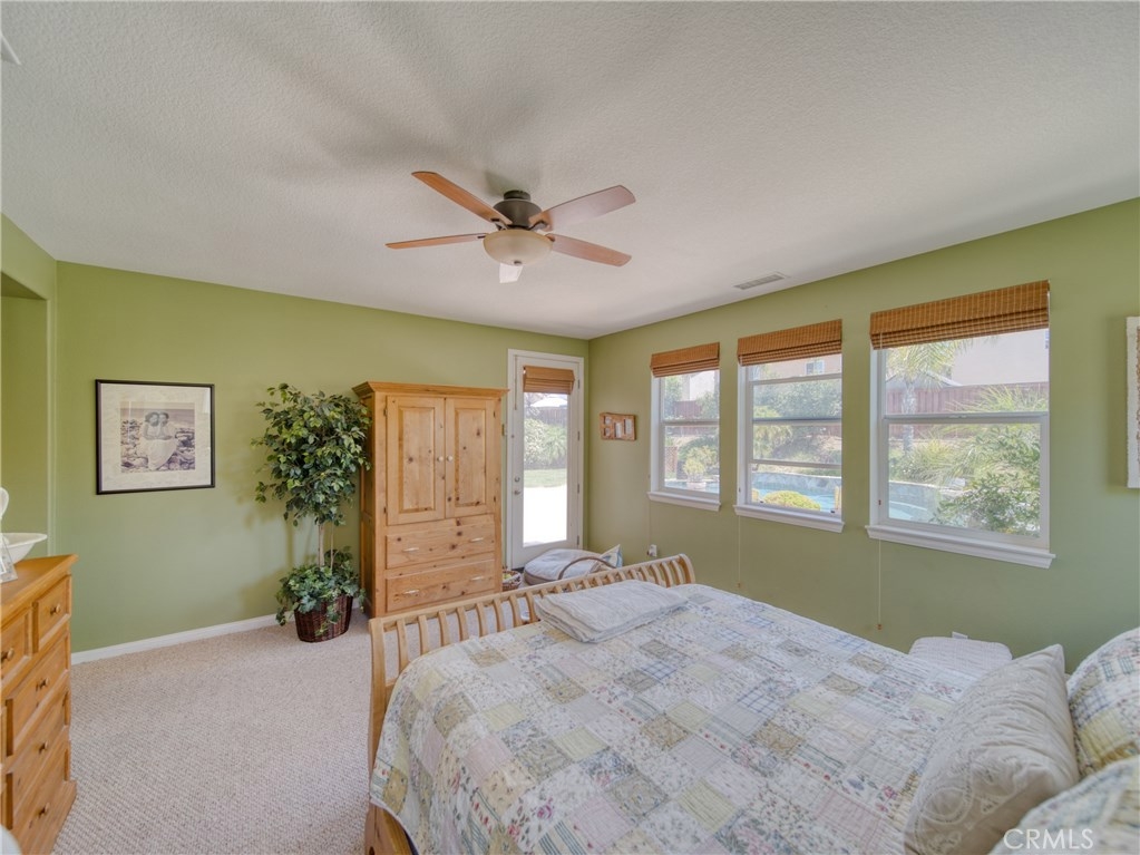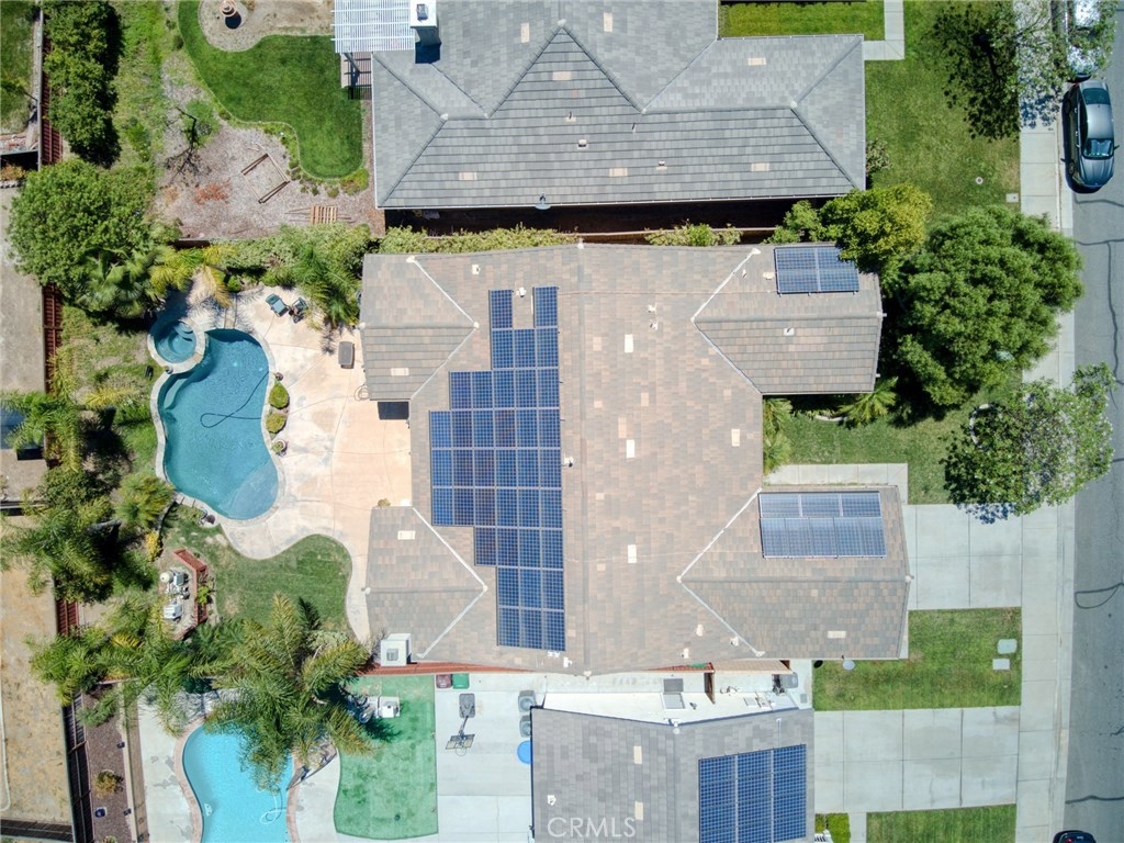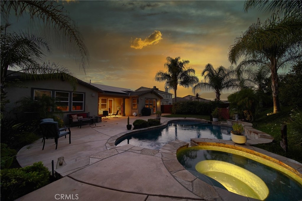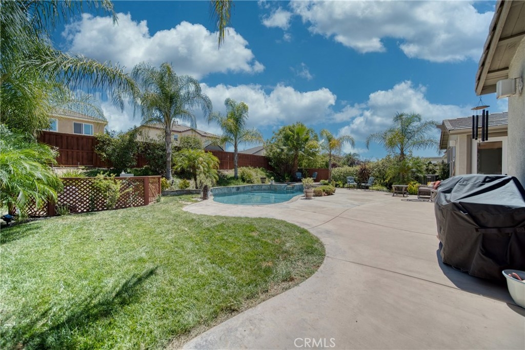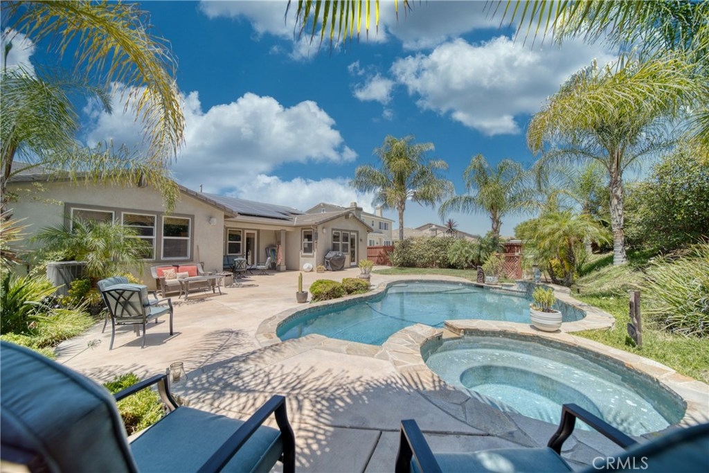 Single Story Heritage Lake Pool Home that is an Entertainers Delight. This beautiful 4 bedroom 2.5 bathroom home is dialed in and turnkey. The floor plan is nothing but amazing entering the home towards the formal dining room, open concept kitchen with breakfast bar island, dual oven and stainless steel appliances, open to fireplace living room, tile flooring and plenty of cabinetry for storage. The master suite has a view of the pool and entry to the backyard with a fantastic master bath with separate tile tub and shower, plus a large walk-in closet with built-ins. Down the hall offers 4 great sized bedrooms and 2 spacious guest bathrooms. Plantation shutters on every front facing window, blinds on the rear windows and security locks/alarms on all doors to exterior for pool safety. Enter into your breathtaking oasis backyard equipped with an 8 foot deep salt water pool/spa with a brand new self cleaning pool system. The back of the home has a nice California patio and a surround sound system equipped to play both indoor/outdoor. Home also has solar lease through Tesla. This is a perfect neighborhood in the highly desired Heritage Lake Community that is well maintained and super quiet with the home close to the lake with walking trails throughout.