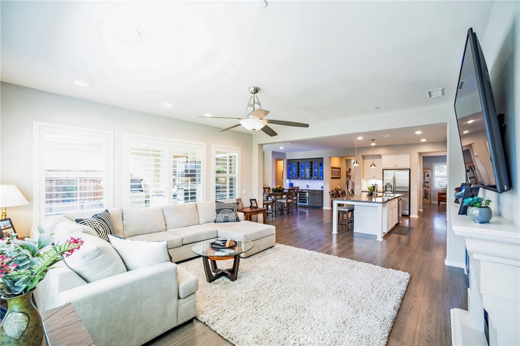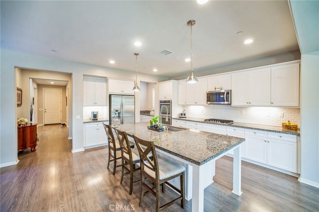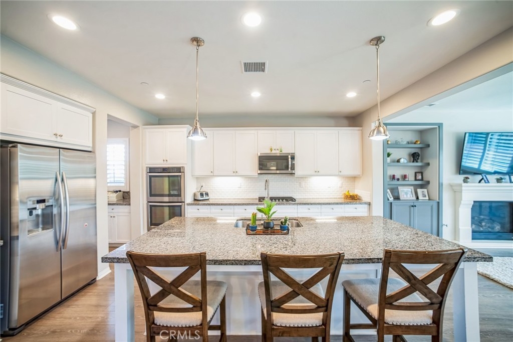 The chef’s kitchen features upgraded white cabinetry, granite countertops, a subway tile backsplash, and double ovens. A large island with pendant lighting creates a central gathering space, while the butler’s pantry and walk-in pantry provide ample storage. A custom wine bar with a built-in wine fridge, hutch, counter, backsplash, and LED lighting adds a touch of luxury. The open-concept family room, complete with custom cabinets and shelving, seamlessly connects to the kitchen and dining areas.