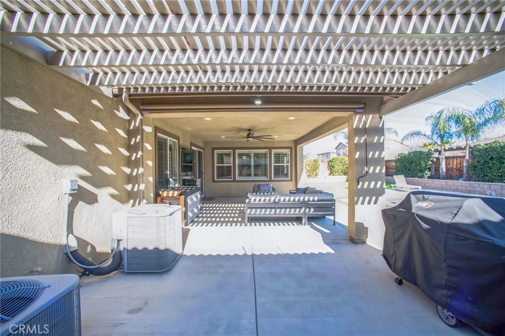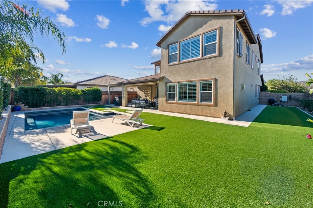 Step outside to a backyard built for entertaining. The 18x30 saltwater pool is surrounded by low-maintenance artificial turf, raised flower beds, and extended hardscape areas. A built-in patio cover with retractable sunshades and an additional 12x20 Aluma Wood cover ensure comfort in all seasons. Exterior lighting enhances the space, while the pool storage cabinet and hard deck areas add convenience.