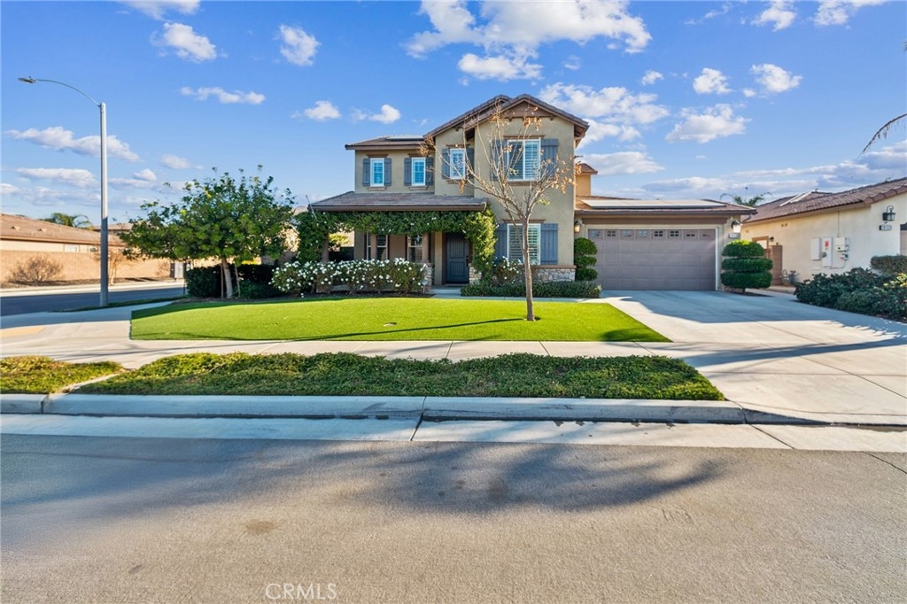 Thoughtful upgrades, include plantation shutters, upgraded laminate wood flooring on the main level, low-pile carpet in the bedrooms, and tile in the bathrooms and laundry room. Energy-efficient features include a dual-zone HVAC system, tankless water heater, and a fully paid-off solar system with 18 Tesla panels (5.525 kW). The 3-car tandem garage offers custom overhead storage, and the upstairs laundry room includes a sink and additional cabinets.