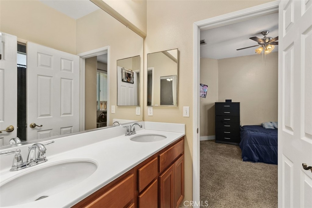 The open-concept family room features a cozy fireplace and leads into a spacious kitchen, equipped with a large island, breakfast bar, stainless steel appliances, and granite countertops. The primary suite has a recessed ceiling, plantation shutters, a walk-in closet, and a luxurious bathroom that includes dual sinks, separate vanities, soft-close drawers, a soaking tub, a rainfall shower, and a modern high-tech mirror perfect for content creation. Two additional bedrooms down the hall share a Jack-and-Jill bathroom, and there’s an additional half bath for guest use.